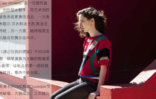 简介: 本期节目嘉宾克莱尔·文森(Clea Vincent)是一位随性直率的巴黎姑娘,创作型女歌手,在艺术创作的道路上,她感恩承前更勇往启后,一方面她完美传承着米歇尔·贝吉和法兰西·高法式香颂流行乐的传统;另一方面,她将极简主义现代元素有机融合到舞步曲风中。她的首张专辑《请记住我的愿望》于2016年发行,好评如潮,钢琴演奏为主轴的歌曲里,加入Pop流行乐旋律,让听众的第一感轻盈美妙、进而渐渐眩目、最终不能自拔。